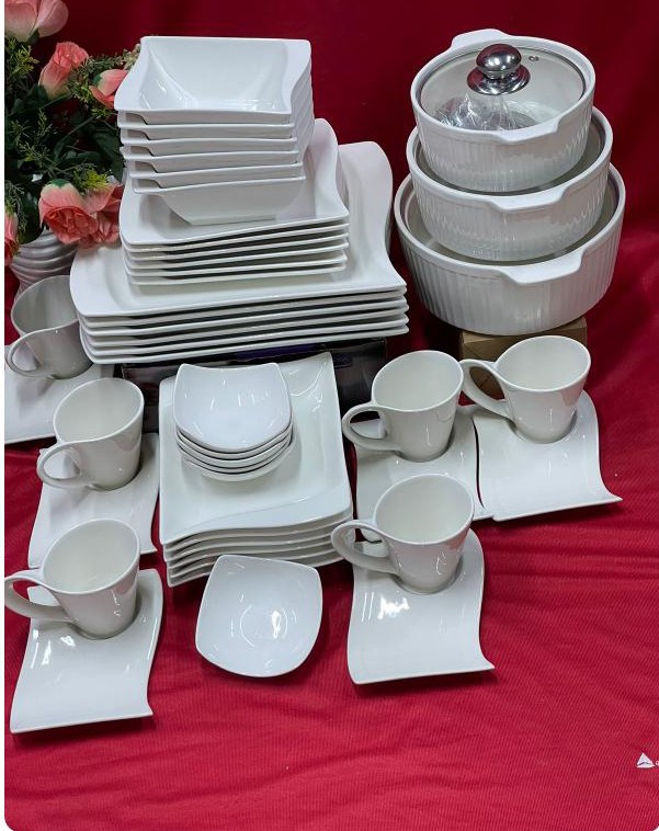 48 PCs dinner set ✅6 cups ✅6 saucers ✅6 bowls ✅6 soup plates ✅6 side plates ✅plates ✅6 sauce cups ✅3 servings dishes ✅3 glass lids